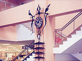 ”スーパーマーケットの3階までの吹抜けに縦長のからくり時計を”とのご要望でヨーロッパ調のデザインでまとめました。音楽と共に飾り物が左右に動き、花の飾りが目盛まで動きます。